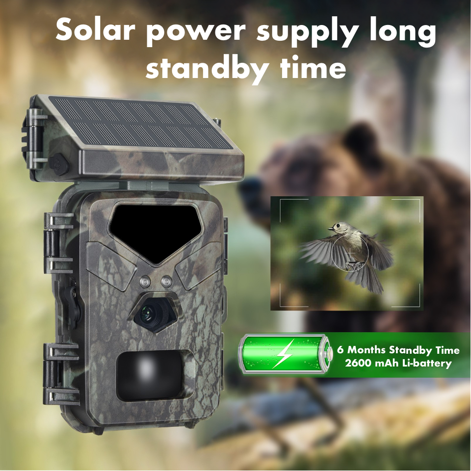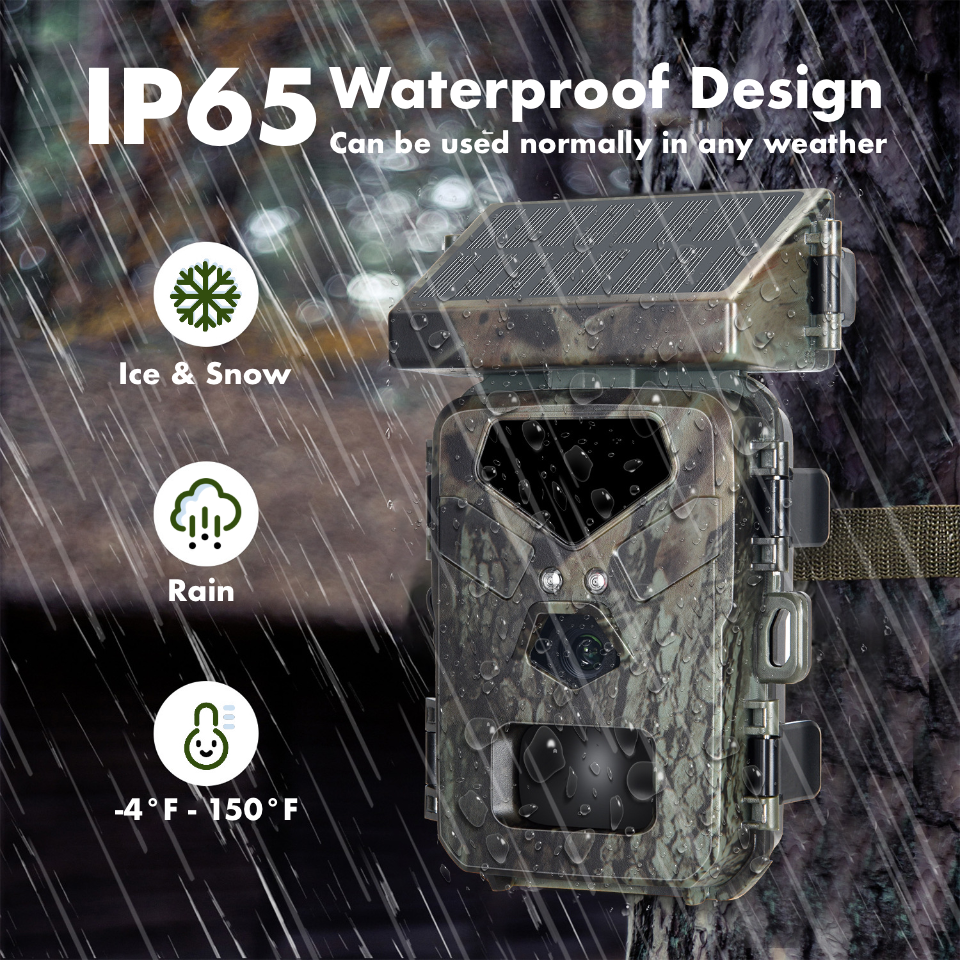 With an IP65 waterproof rating, the Smart wildlife camera with solar recharge thrives in extreme conditions, enduring temperatures from -4°F (-20°C) to 150°F (65°C). Trust it to perform in any weather.
