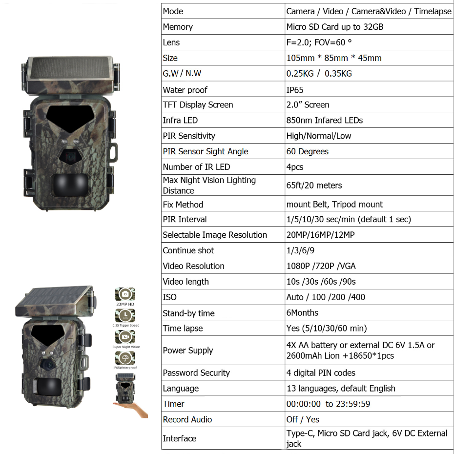 Discover the features of our Smart wildlife camera with solar recharge that make it truly unique. With support for 13 languages and unparalleled ease of use, this camera caters to users of all backgrounds. Its exceptional 20mp quality and Full HD 1080p video recording capability allow you to capture unique moments in the forest with stunning clarity.